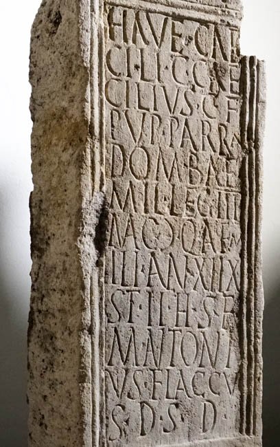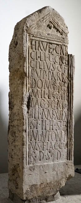 - Have Cae/cili C(aius) Cae/cilius C(ai) f(ilius) / Pup(inia) Parra / dom(o) Bae(terris) / mil(es) leg(ionis) IIII Mac(edonicae) |(centuria) Q(uinti) Aem/ili an(norum) XIIX / st(ipendiorum) II h(ic) s(itus) e(st) / M(arcus) Antoni/us Flaccu/s d(e) s(uo) d(edit)