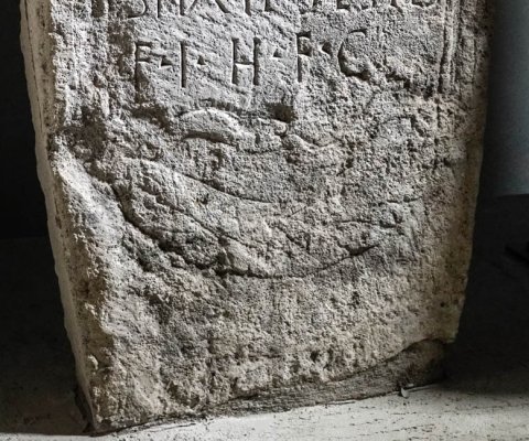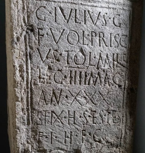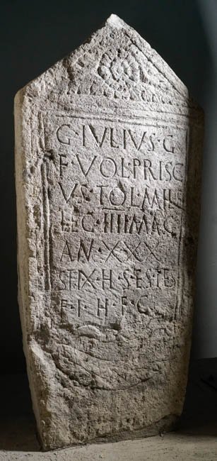 - G(aius) Iulius G(ai) / f(ilius) Vol(tinia) Prisc/us Tol(osa) mile(s)(!) / leg(ionis) IIII Mac(edonicae) an(norum) XXX / sti(pendiorum) X h(ic) s(itus) es(t) tes(amento) / f(ieri) i(ussit) h(eres) f(aciendum) c(uravit)