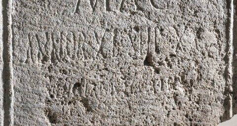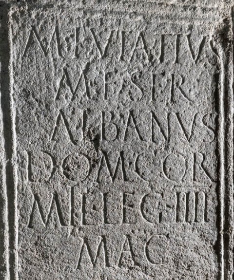- M(arcus) Lutatius / M(arci) f(ilius) Ser(gia) / Albanus / dom(o) Cor(finio) / mil(es) leg(ionis) IIII / Mac(edonicae) / annor(um) XL stip(endiorum) XX / Ventilator h(eres) fecit