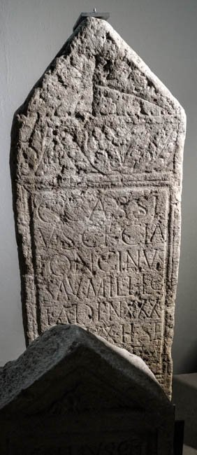 - C(aius) Cassi/us C(ai) f(ilius) Cla(udia) / Longinus / Sav(aria) mil(es) leg(ionis) / I adi(utricis) an(norum) XXX / stip(endiorum) X h(ic) s(itus) e(st) / h(eres) f(aciendum) c(uravit)