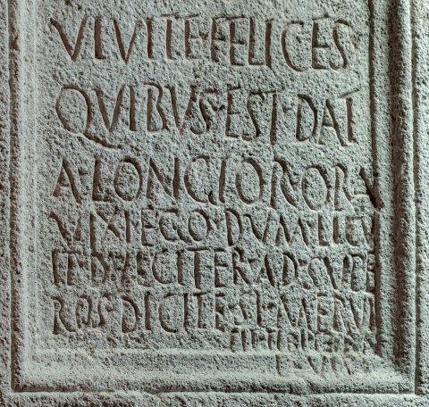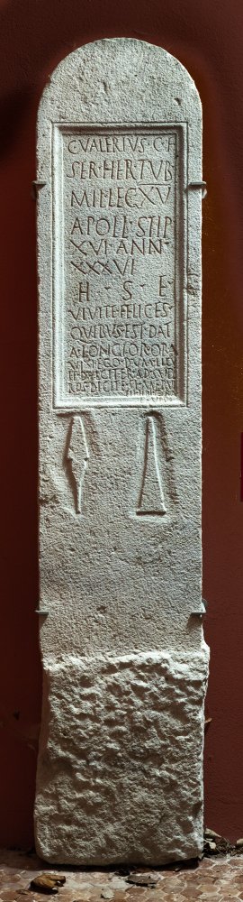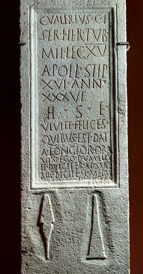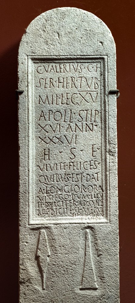 - C(aius) Valerius C(ai) f(ilius) / Ser(gia) Her() tub(icen) / mil(es) leg(ionis) XV / Apoll(inaris) stip(endiorum) / XVI ann(orum) / XXXVI / h(ic) s(itus) e(st) / vivite felices / quibus est dat/a longior ora / vixi ego dum licu/it dulciter ad supe/ros dicite si merui / sit tibi ter(r)a / levis
