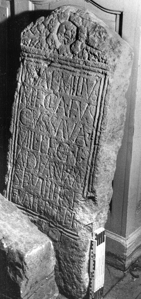 - M(arcus) Aemilius / M(arci) f(ilius) Cla(udia) Fus/cus Sava(ria) / mil(es) leg(ionis) I / Adi(utricis) an(norum) XXV / stip(endiorum) VIII h(ic) s(itus) e(st) / frater pr(o) p(ietate) p(osuit)