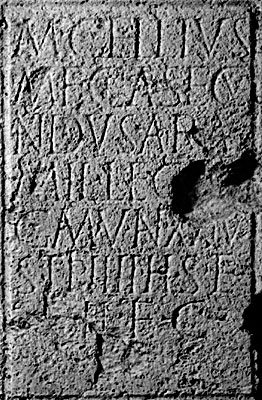 - M(arcus) Gellius / M(arci) f(ilius) Cla(udia) Secu/ndus Ara / mil(es) leg(ionis) [XIIII] / G(eminae) M(artiae) V(ictricis) an(norum) XXIV / stip(endiorum) IIII h(ic) s(itus) e(st) / h(eres) f(aciendum) c(uravit)