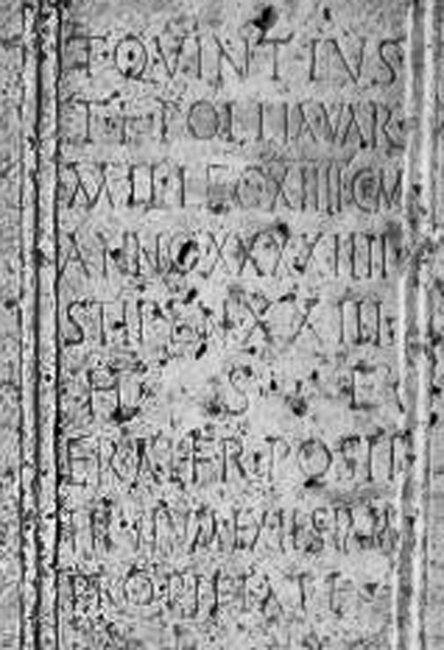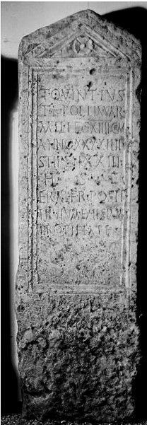 - T(itus) Quintius / T(iti) f(ilius) Pollia Var(dagate) / mil(es) leg(ionis) XIIII <g=C>em(inae) / anno(rum) XXXXIIII / stipen(diorum) XXIII / h(ic) s(itus) e(st) / frater pos(u)it / titulum ex testam(ento) / pro pietate