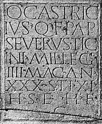 - Q(uintus) Castric/ius Q(uinti) f(ilius) Pap(iria) / Severus Tic/ini mil(es) leg(ionis) / IIII Mac(edonicae) an(norum) / XXX sti(pendiorum) XI / h(ic) s(itus) e(st) h(eres) f(aciendum) / c(uravit)