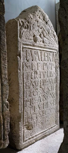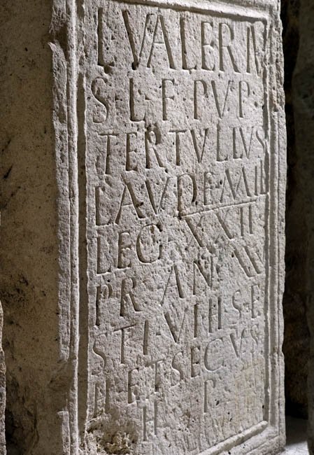 - L(ucius) Valeriu/s L(uci) f(ilius) Pup(inia) / Tertullus / Laude mil(es) / leg(ionis) XXII / Pr(imigeniae) an(norum) XXVI / sti(pendiorum) VI h(ic) s(itus) e(st) / h(eredes) et sec(und)us / h(eres) p(osuerunt)