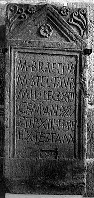 - M(arcus) Braetius / M(arci) (!) Stel(latina) Taur(inis) / mil(es) leg(ionis) XIII / Gem(inae) an(norum) XXXV / stip(endiorum) XIII h(ic) s(itus) e(st) / ex testam(ento)