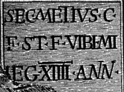 - Sec(undus) Metius C(ai) / f(ilius) St(ellatina) F(oro) Vibi mi(les) / leg(ionis) XIIII (!) ann(orum) / [---