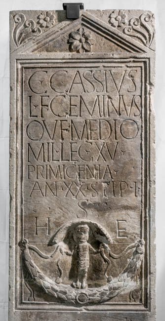 - C(aius) Cassius / L(uci) f(ilius) Geminus / Ouf(entina) Medio(lano) / mil(es) leg(ionis) XV / Primigenia(e) / an(norum) XX stip(endii) I / h(ic) s(itus) e(st)