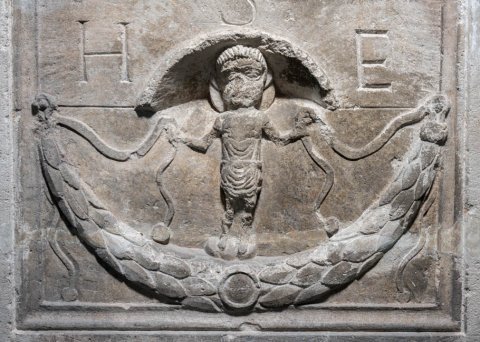 - Giebel mit Rosette, Palmetten-Eckakrotere, Rosetten über den Giebelschrägen. Schriftfeld gerahmt, unterhalb der Inschrift Girlande mit Clipeus und Tänien, über der Girlande Basis mit stehendem Mann in kurzer Tunica, der mit beiden Händen die Tänien hält. Über seinem Kopf mit Nimbus (?) Bogen mit Muschelnische.