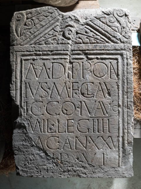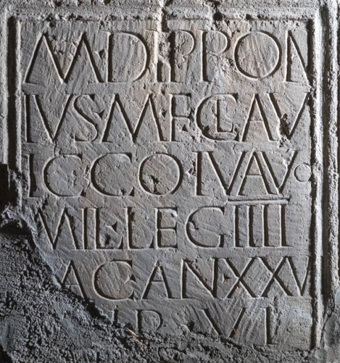 - M(arcus) Dippon/ius M(arci) f(ilius) Clau(dia) / Icco Iu(v)avo / mil(es) leg(ionis) IIII / Mac(edonicae) an(norum) XXVI / [st]ip(endiorum) VI / [h(ic) s(itus) e(st) h(eres) f(aciendum)] c(uravit)