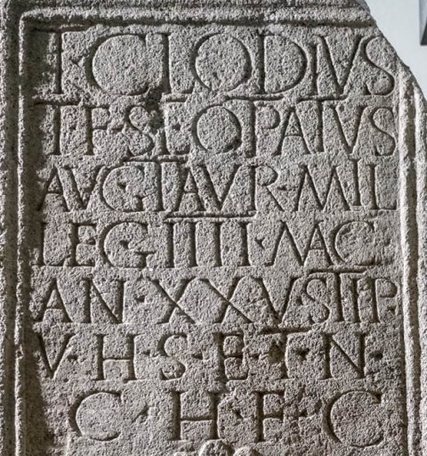 - T(itus) Clodius / T(iti) f(ilius) Ste(llatina) Optatus / Aug(usta) Taur(inorum) mil(es) / leg(ionis) IIII Mac(edonicae) / an(norum) XXV stip(endiorum) / V h(ic) s(itus) e(st) T(itus) N(---) / C(---) h(eres) f(aciendum) c(uravit)