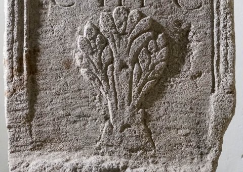 - Giebel mit Rosette und Akanthusblättern, Palmetten-Eckakrotere. Schriftfeld gerahmt, unterhalb der Inschrift Baum.