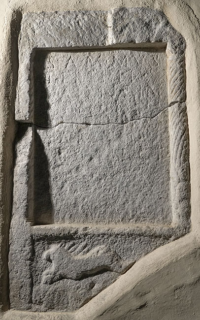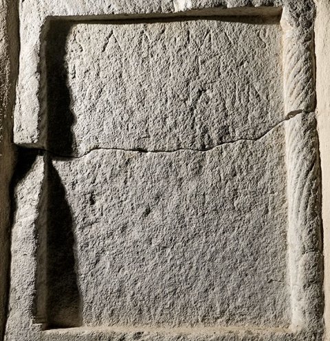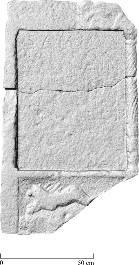 - Schriftfeld zwischen Säulen mit Spiralkanneluren. Im Sockelbild Meerwesen (Seegreif ?).