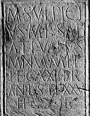 - M(arcus) Sulpici/us M(arci) f(ilius) Sab/ati(na) Vale(n)s / Mantua mil(es) leg(ionis) XXII Pr(imigeniae) / an(norum) L stip(endiorum) XXV / h(ic) s(itus) e(st)