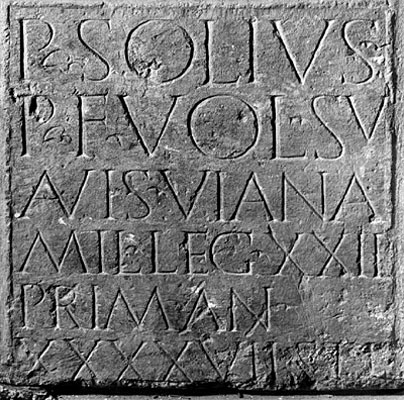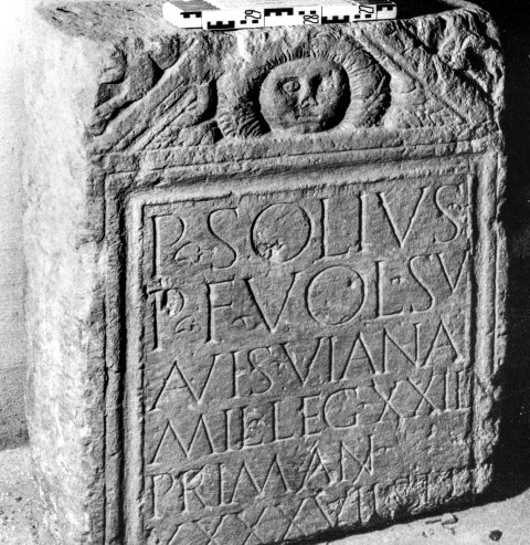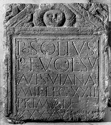 - P(ublius) Solius / P(ubli) f(ilius) Vol(tinia) Sua/vis Viana / mil(es) leg(ionis) XXII / Prim(igeniae) an(norum) XXXXVII sti(pendiorum) / [---