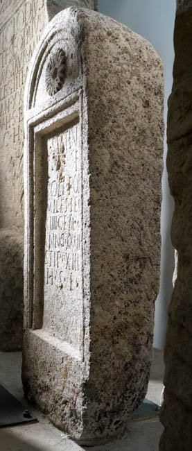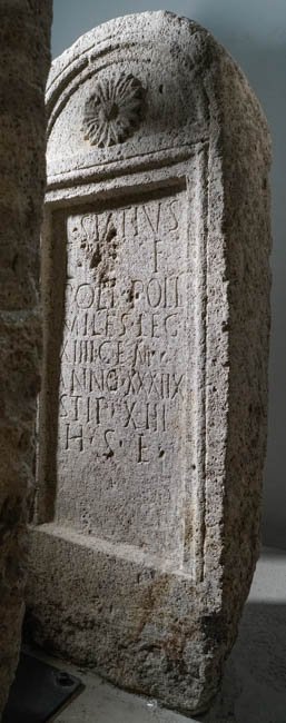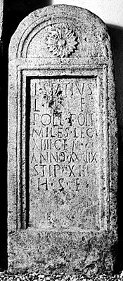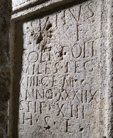 - L(ucius) Statius / L(uci) f(ilius) / Poll(ia) Pol(l)e(ntia) / miles leg(ionis) / XIIII gem(inae) / anno(rum) XXXIIX / stip(endiorum) XIII / h(ic) s(itus) e(st)