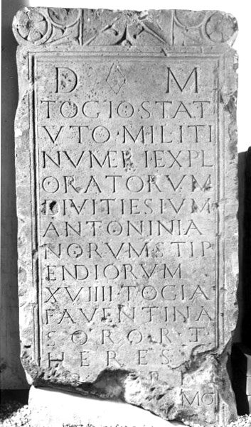 - D(is) M(anibus) / Togio Stat/uto militi / numeri expl/oratorum / Divitie(n)sium / Antoninia/norum stip/endiorum / XVIIII Togia / Faventina / soror et heres / [frat]ri / [carissi]mo(?) / f(aciendum) [c(uravit)]
