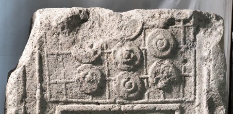 - Inschrift in tabula ansata, darüber Gitternetz mit Phalerae, links Lanze ? (hasta pura ?).