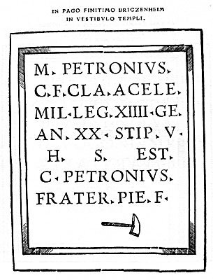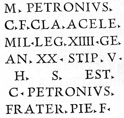 - M(arcus) Petronius / C(ai) f(ilius) Cla(udia) Acele / mil(es) leg(ionis) XIIII Ge(minae) / an(norum) XX sti(pendiorum) / V h(ic) s(itus) est / C(aius) Petronius / frater / pie fec(it)
