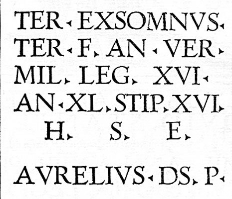 - Ter(tius) Exsomnus / Ter(ti) f(ilius) Ani(ensi) Ver(cellis) / mil(es) leg(ionis) XVI / an(norum) XL sti(pendiorum) XVI / h(ic) s(itus) e(st) / Aurelius d(e) s(uo) p(osuit?)