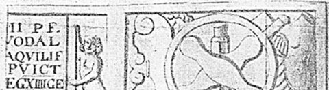 - Eckblock. Auf der Vorderseite Inschrift in von Genien gehaltener tabula ansata (die Formel Dis Manibus auf den Podesten, auf denen die Genien stehen). Auf der rechten Nebenseite unten Fries mit Spiralranken, darüber Bildfeld mit Waffen (Rundschild, Beinschienen, Schwert, Peltenschild, Panzer, Köcher).