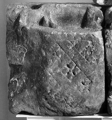 - Blöcke A, B, C von der linken Wand eines Grabbaus: links unten Rautengitter mit Rosettenfüllungen, darüber Bildfeld mit nach rechts gehendem Mann mit Sagum. Waffen: Panzer, Schwert an der linken Seite. Von einer folgenden Figur nur ein Fuß erhalten. Rechts anschließend mit Pilastern gerahmtes Feld mit Akanthusranken, die aus Akanthuskelch wachsen. Block D von der gegenüberliegenden Wand: Rautengitter rechts, vom darüber befindlichen Bildfeld nur linke untere Ecke mit Fuß einer Figur erhalten. Links Feld mit Akanthuskelch
