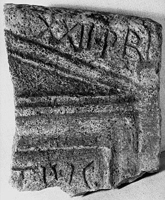 - Gerahmter Giebel (mit patera oder rosette ?), über den Giebelschrägen Inschriftzeile. Schriftfeld gerahmt.