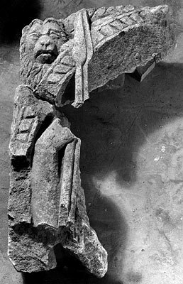 - Bogenförmig gerahmte Bildnische, am Rand tordiertes Band, darüber Ansatz eines Giebels (?) mit Zweig, über dem Bogenansatz liegender Löwe. Vom Hauptbild noch rechter Unterarm und Hand eines Mannes (Soldat) mit zwei Lanzen erhalten.
