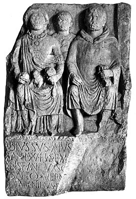 Auf Vorder- und Rückseite Reliefs und Inschriften. Vorderseite: Ganzfiguren einer Familie, sitzendes Ehepaar, zwischen ihnen im Hintergrund Knabe. Links einheimische Frau in langärmeligem Unterkleid, darüber Obergewand und Mantel, beides mit Distelfibeln an den Schultern zusammengehalten, weitere Fibeln auf der Brust. Halsreif mit großer Zierscheibe, Armreifen, Fingerring, Haarnetz (?). In der linken Hand Spindel und Rocken, in der rechten Wollknäuel. auf dem Schoß Hündchen mit glocke um den Hals. Rechts Mann in Kapuzenumhang und halblanger Tunica, in der linken Hand (mit Fingerring) Geldbeutel. In der Mitte Knabe in Tunica, um den Hals Bulla. Unterhalb des Bildnische Schriftfeld.