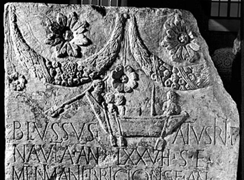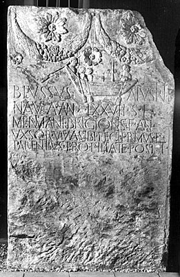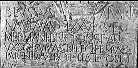 - Blussus Atus[iri f(ilius) nauta] / an(norum) LXXV h(ic) s(itus) e(st) Me[nimane Brigio]/nis f(ilia) an(norum) ux{s}o[r viva sibi fecit] / Satto vern[a an(norum) --- h(ic) s(itus) e(st) Primus] / f(ilius) parentibus p[ro pietate posuit] // Blussus Atusiri f(ilius) / nauta an(norum) LXXV h(ic) s(itus) e(st) / Menimane Brigionis f(ilia) an(norum) / ux{s}or viva sibi fecit Primus f(ilius) / parentibus pro pietate pos(u)it