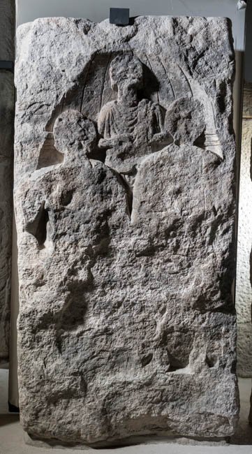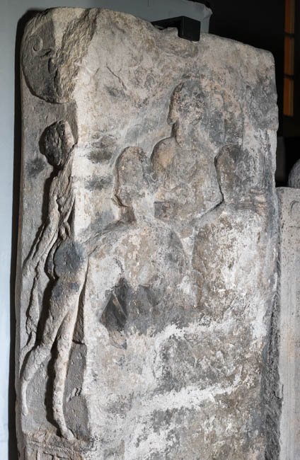 Ganzfiguren einer Familie in einer Muschelnische: im Vordergrund zwei sitzende Ganzfiguren, links Mann, rechts Frau. Zwischen ihnen im Hintergrund Mädchen in tunica und Mantel.