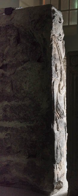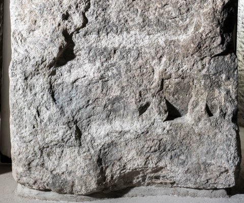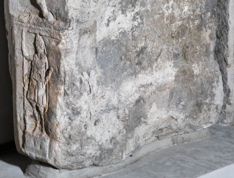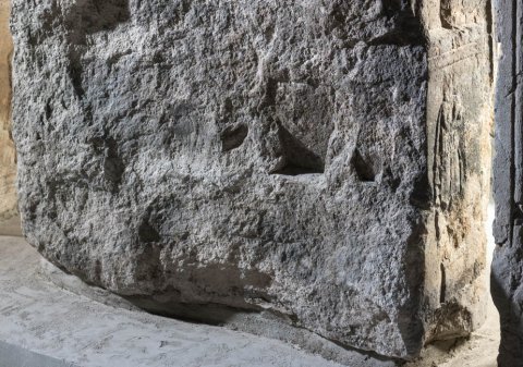 - unten abgebr., Vorderseite z.gr.T. abgearbeitet, in der Oberseite Dübel(?)loch