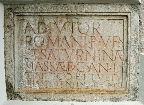 Adiutor / Romani f(ilius) v(ivus) f(ecit) s(ibi) / et Saturninae / Massae f(iliae) c(oniugi) an(norum) L / et Attico f(ilio) et L(uciae?) Vetu/riae Pontentin(a)e c(oniugi) p(ientissimae) an(norum) XL