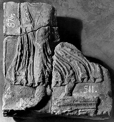 - Mythische Figur: Oberteil eines Podestes mit Füßen und Beinen einer tanzenden Mänade in langem Gewand.