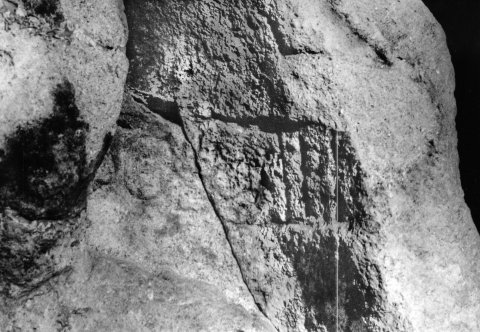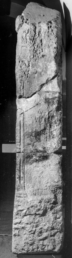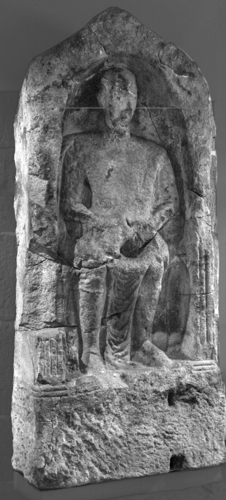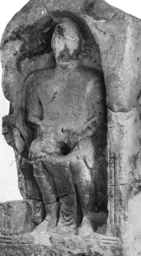 - Offener Giebel auf kannelierten Pilastern, darin Muschelnische mit sitzender Ganzfigur eines Mannes in halblanger Tunica, Mantel und Schuhen. Namensbeischrift zu beiden Seiten des Kopfes.