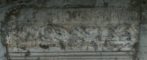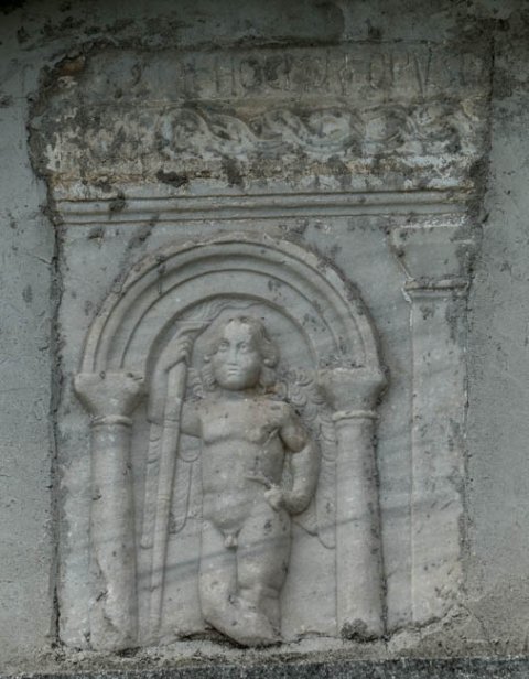- An der rechten Kante glatter Eckpilaster, anschließend Arkade aus profiliertem Bogen, der von Säulen getragen wird. Darunter nackter kindlicher Genius (Erot) mit Fackel in der Rechten. Über dem Bogen profiliertes Gesims und Fries mit Flechtband (?). Auf dem oberen Rahmen frühchristliche Inschrift ?