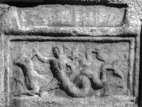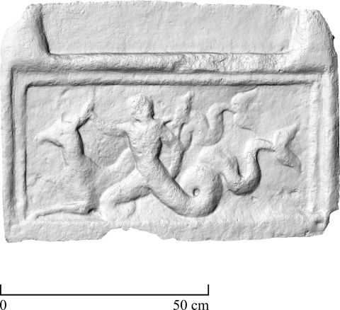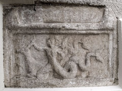 - Schriftfeld zwischen Säulen. Im Sockelbild Meerwesen: Triton, im linken Arm Steuerruder, die Rechte packt Seehirsch am Geweih.