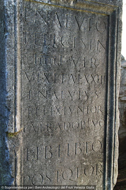 - L(ucio) Naevio / Felici Sen(iori) / IIIIIIvir(o) / vixit a(nnos) LXXIIII / L(ucius) Naevius / Felix Iunior / patr(i) adoptivo / lib(ertis) lib(er)t(abus)q(ue) / post(eris)q(ue) eor(um)