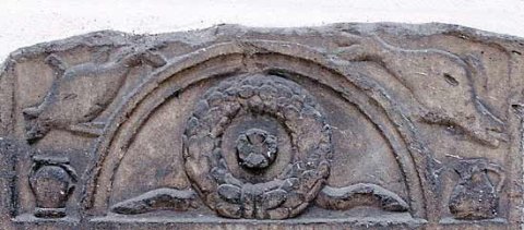 - Seitlich Pilaster mit Pflanzenornament, über der Inschrift gerahmtes Bogenfeld, darin Kranz mit Tänien und Rosette. In den Zwickeln rechts Kanne, links Urne, darüber jeweils Delphin.