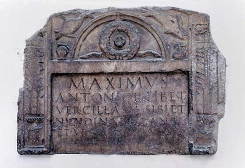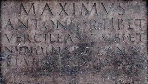 - Maximus / Antonior(um) lib(ertus) et / Vercilla v(ivi) f(ecerunt) sibi et / Nundinae fil(iae) an(norum) V / et Urso filio an(norum) XXX