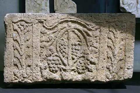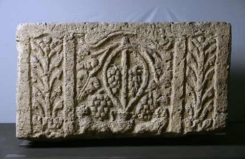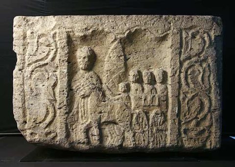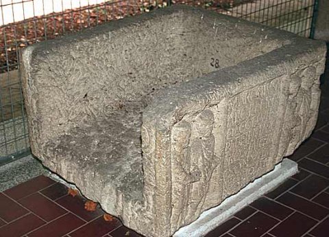 Auf der rechten Schmalseite Wagenszene: Feld mit gewelltem oberen Rand zwischen Rahmenfeldern mit Efeuranken. Leiterwagen mit Viergespann, Kutscher und drei Fahrgästen. Neben den Pferden größerer Mann, im Hintergrund Baum. Auf der Rückseite Weinranken. - Inschrift