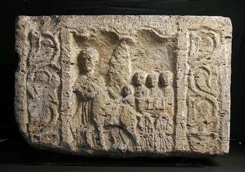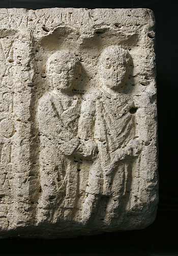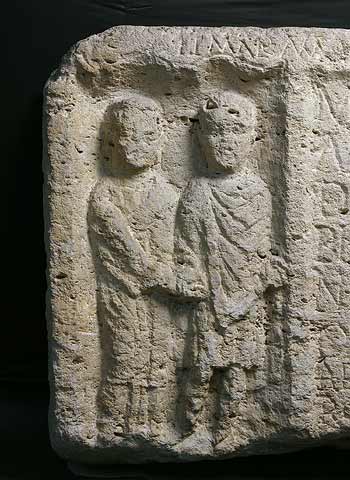 Schriftfeld zwischen Seitenfeldern mit je einem Ehepaar. Links Frau in Tunica und Mantel, hält die Hand des rechts stehenden Mannes in kurzer Tunica, Sagum, Scheibenfibel, in der Linken Rolle (volumen).