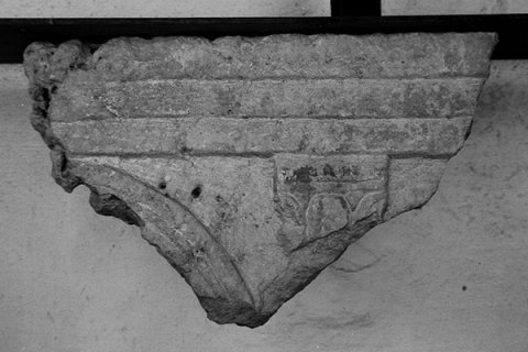 - Wandfragment mit Fascien-Architrav, der von einem Pilaster mit Blattkapitell getragen wird. Rechts vom Pilaster glatte Wand, links profiliert gerahmte Bogenöffnung.