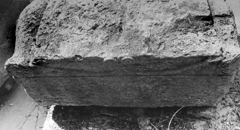 - Block mit geschnürten pulvini mit Rosetten, dazwischen auf der Vorderseite zusammengebundene Volutenranken