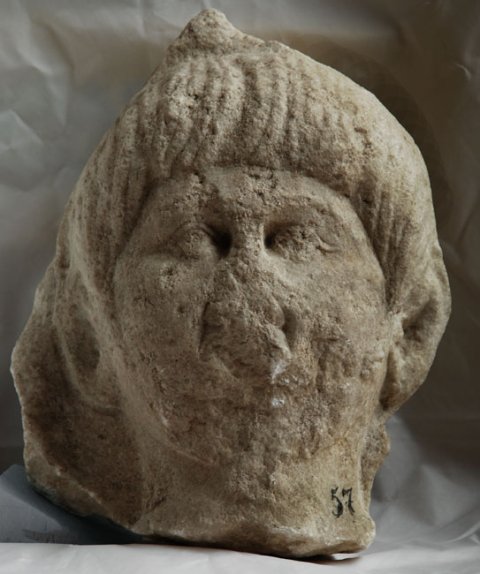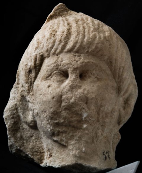 - Porträt eines bartlosen Jünglings mit in die Stirn gekämmtem glatten Haar und Koteletten. Teil eines Grabreliefs.