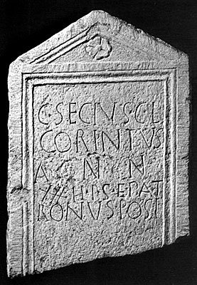 - C(aius) Secius C(ai) l(ibertus) / Corintus / ann(orum) / XXX h(ic) i(ntus) s(itus) e(st) pat/ronus pos(u)i(t)