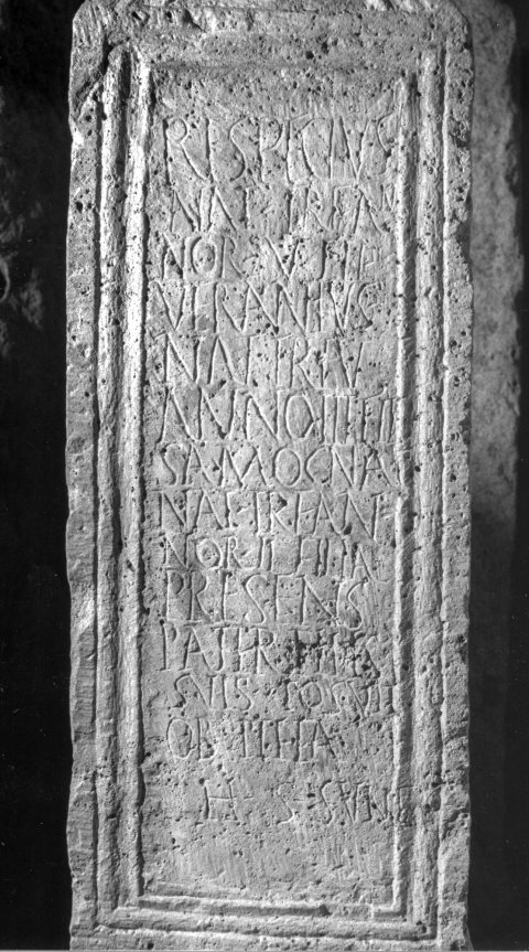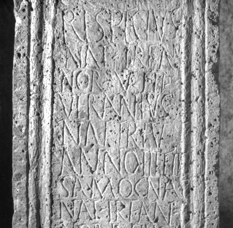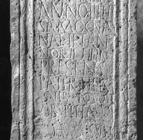 - Respectus / nat(ione) Tre(ver) an/nor(um) VIII / Veranius / nat(ione) Trev(er) / anno(rum) IIIIII / Samocna / nat(ione) Tre(ver) an/nor(um) II filia / Pr(a)esens / pater fili(i)s / suis posuit / ob pieta(tem) / h(ic) s(iti) sunt
