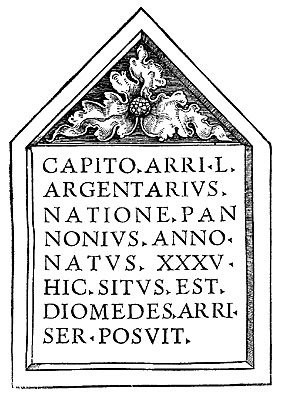 - Capito / Arri l(ibertus) / argentarius / natione Pan/nonius anno(rum) / natus XXXV / hic situs est / Diomedes Arri / ser(vus) posuit