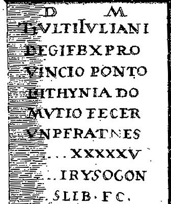 - D(is) M(anibus) / Ti(beri) Ulpi Iuliani / neg(otiatoris) i(n) f(erro?) ex pro/vincia Ponto / Bithynia domu Tio(?) fecer/unt fratres / [vix(it)] an(nos) XXXV / [C]hrysogon/[u]s lib(ertus) f(aciendum) c(uravit)